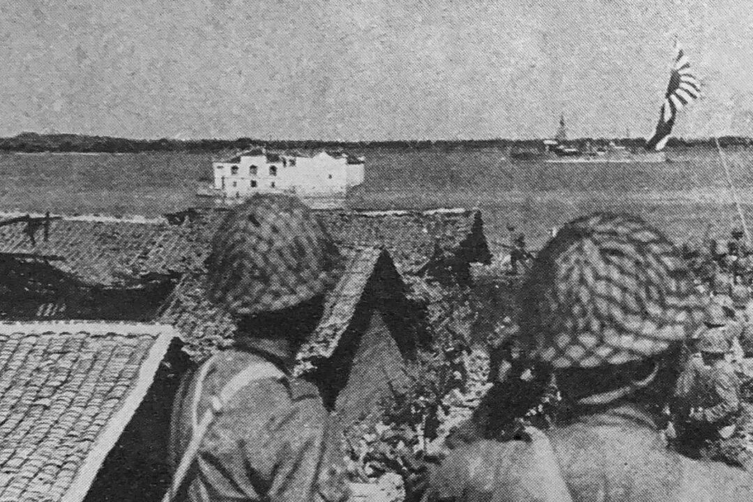 1938年武汉会战期间,侵华日军在在湖北鄂城(现湖北鄂州)长江边远眺长江中心的鄂州观音阁,画面右侧近处,一面象征着日本帝国主义的太阳旗十分醒目,画面远处江面是一艘巡弋江面的日本军舰。【图片由湖北日报全媒记者何宇欣扫描自日本于昭和十三年(1938年)十一月二十日印刷的世界画报】