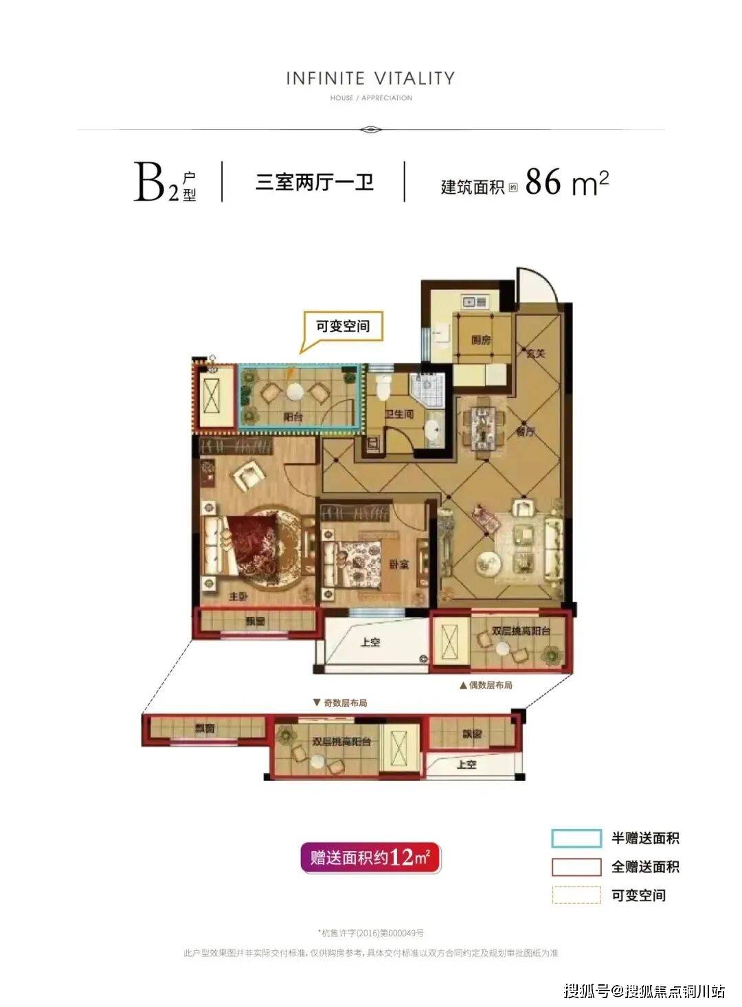 【86方】建筑面积约86㎡的两室两厅一厨一厅户型,可变空间充裕,北面的阳台稍作改装就能变成书房,这样一来就是非常标准的“小三房”。
